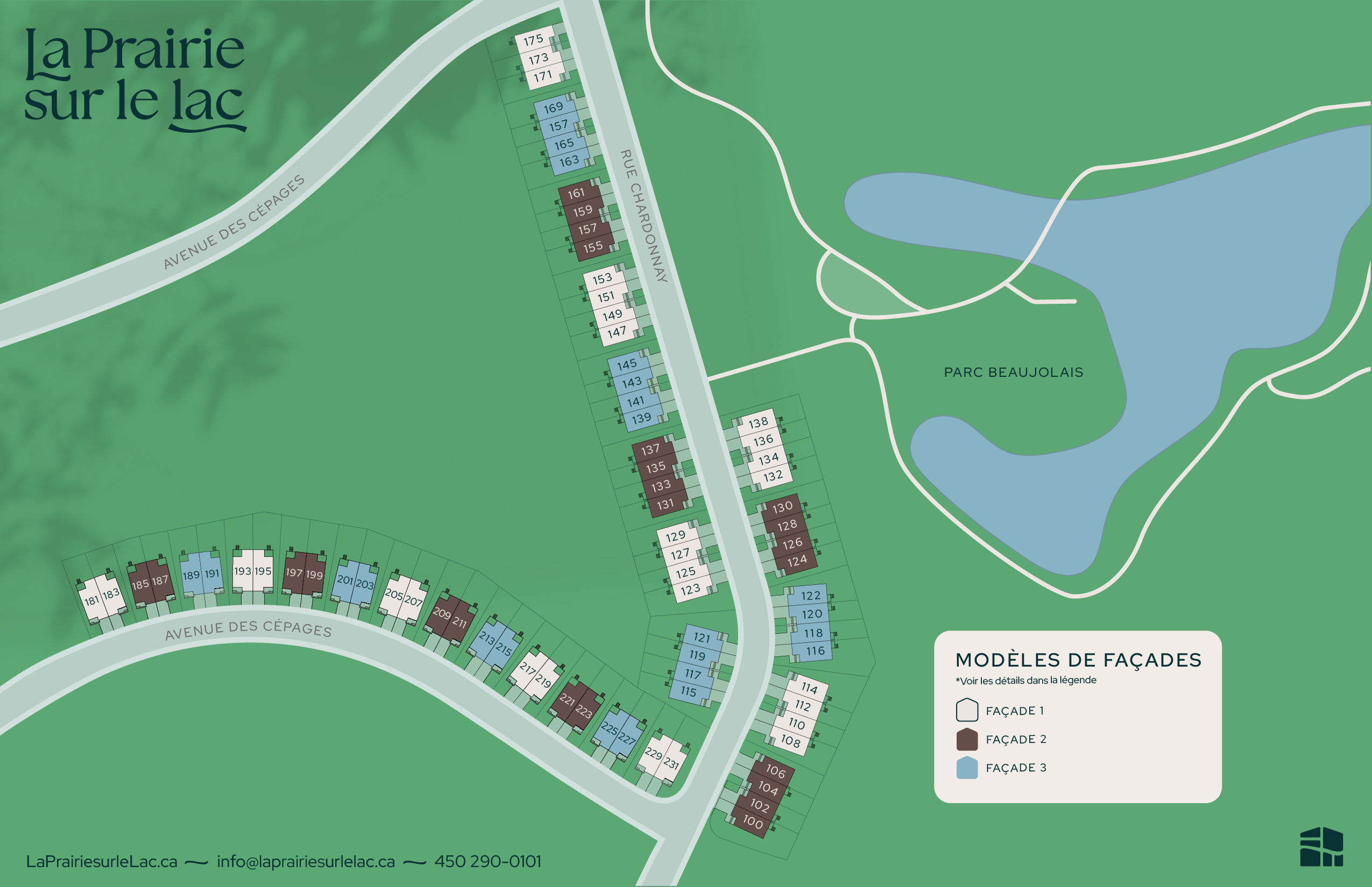 Enfin, selon le terrain sélectionné, trois styles de façades sont proposés, permettant à chaque demeure de se distinguer tout en s’intégrant harmonieusement à l’ensemble du projet. Certains terrains, sans voisin arrière et bordés par le parc et le lac, offrent un cadre de vie paisible et intime.
