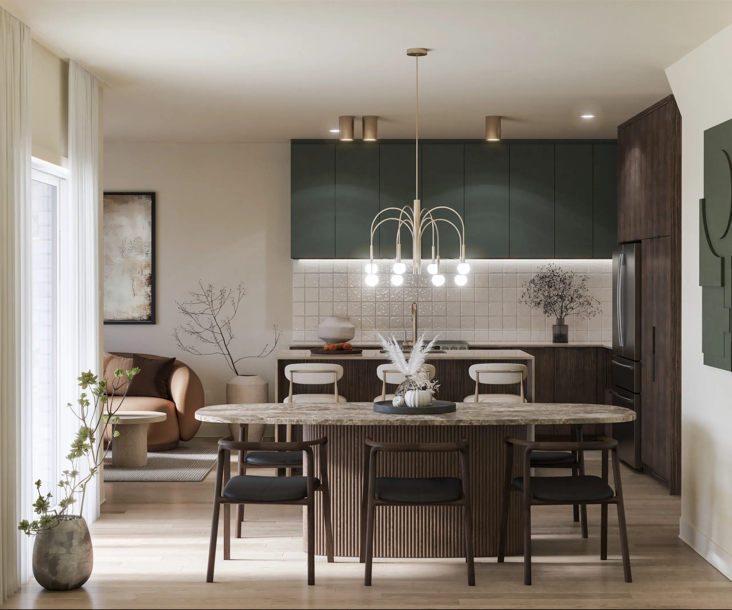 Chaque maison propose une cuisine conviviale, équipée d’un comptoir de quartz et de nombreux rangements, idéale pour recevoir et partager. Le grand balcon couvert prolonge l’espace de vie vers l’extérieur et offre un cadre intime et agréable.